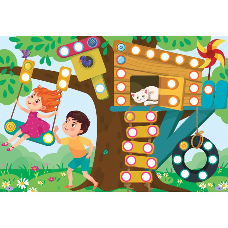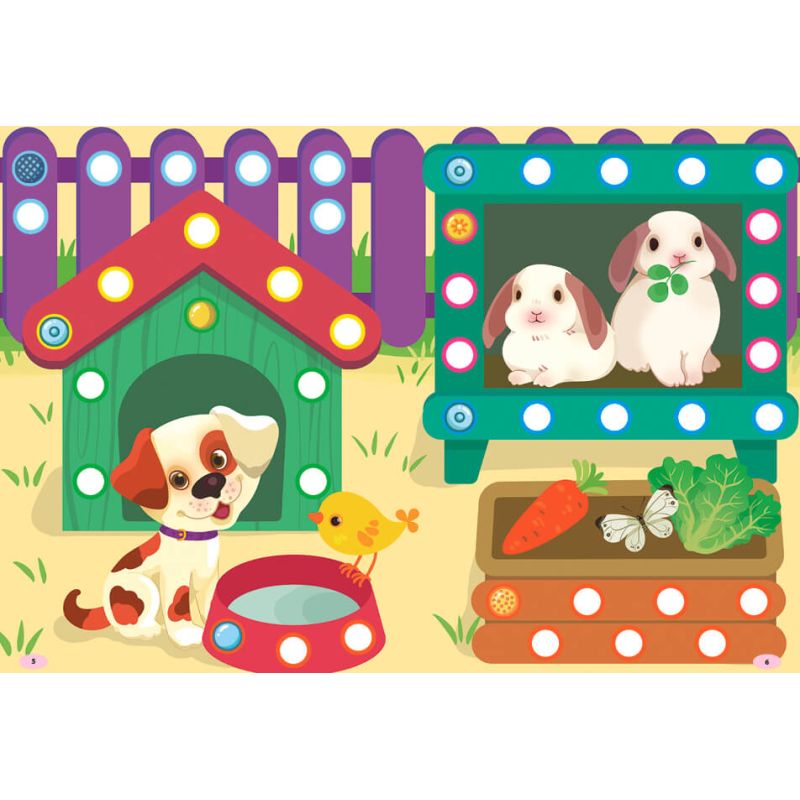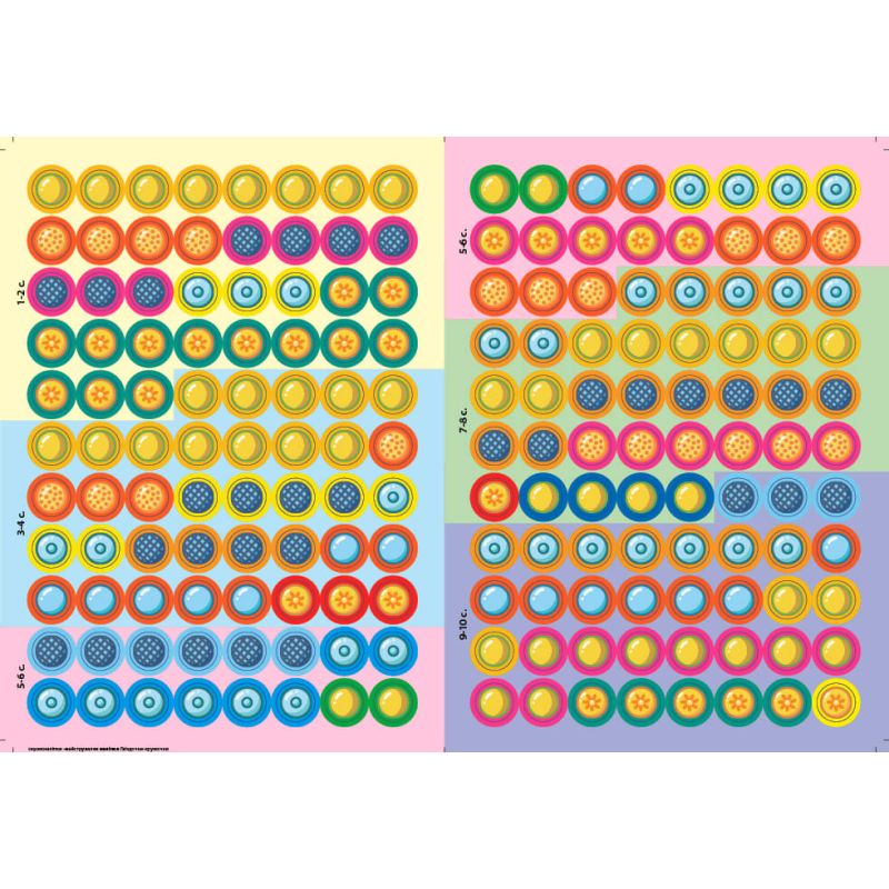 Видання містить 176 наліпок – різнокольорових гвіздочків і кружечків. Дитина має доповнити за їхньою допомогою картинки: вклеїти їх у порожні кружечки за зразком. Колір контура наліпок послугує малюкові підказкою.