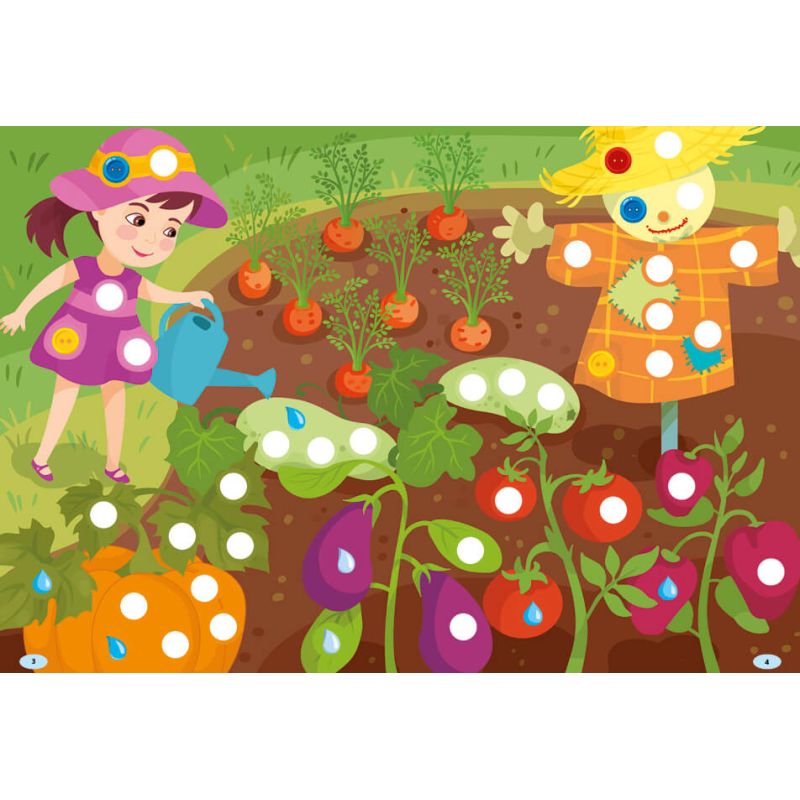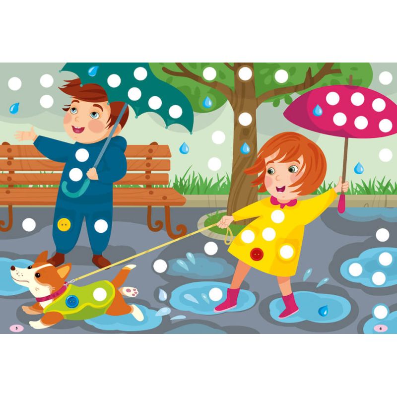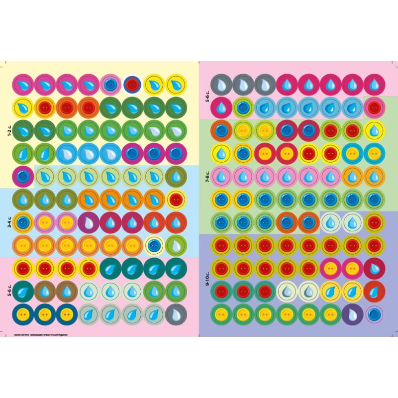 Видання містить 176 наліпок – різнокольорових крапельок і ґудзиків. Дитина має доповнити за їхньою допомогою картинки: вклеїти їх у порожні кружечки за зразком. Колір контура наліпок послугує малюкові підказкою.