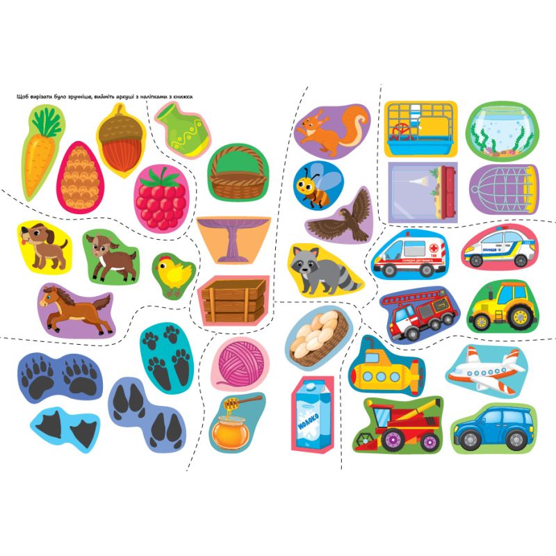 У ній зібрані різноманітні цікаві малюнки, які потрібно доповнити простими й зрозумілими наліпками-деталями. Усі наліпки дитина має вирізати по контуру й наклеїти самостійно. Книжки спрямовані на розвиток дрібної моторики та навички роботи з ножицями, а також допоможуть потренувати пам’ять, логічне й асоціативне мислення, виховати акуратність і посидючість.