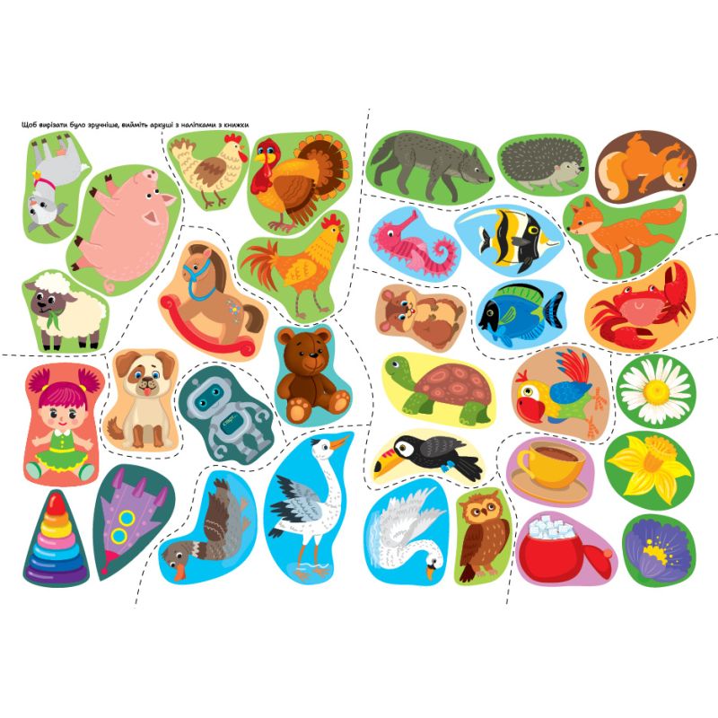 У ній зібрані різноманітні цікаві малюнки, які потрібно доповнити простими й зрозумілими наліпками-деталями. Усі наліпки дитина має вирізати по контуру й наклеїти самостійно. Книжки спрямовані на розвиток дрібної моторики та навички роботи з ножицями, а також допоможуть потренувати пам’ять, логічне й асоціативне мислення, виховати акуратність і посидючість.