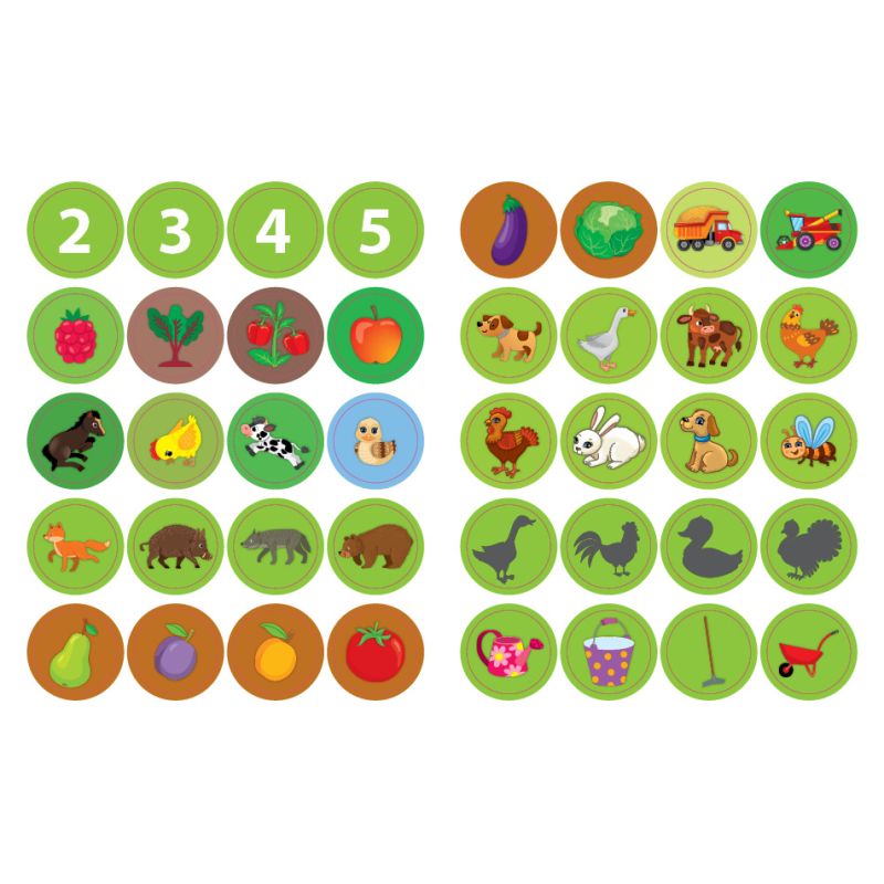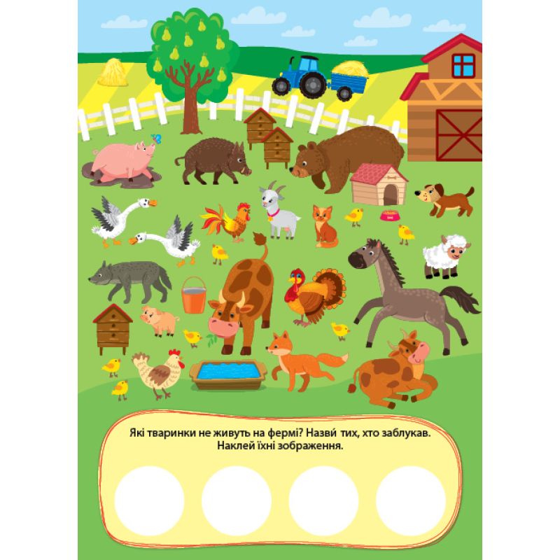 Разом із цією книжкою дитина здійснить прогулянку різними локаціями: побуває на пасовиську та городі, прогуляється лугом та полем, завітає на ферму. Різні локації — різні пригоди із завданнями з наліпками, що допоможуть потренувати увагу та уяву, логічне мислення та пам’ять, а також розвинути мовленнєві здібності.