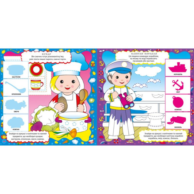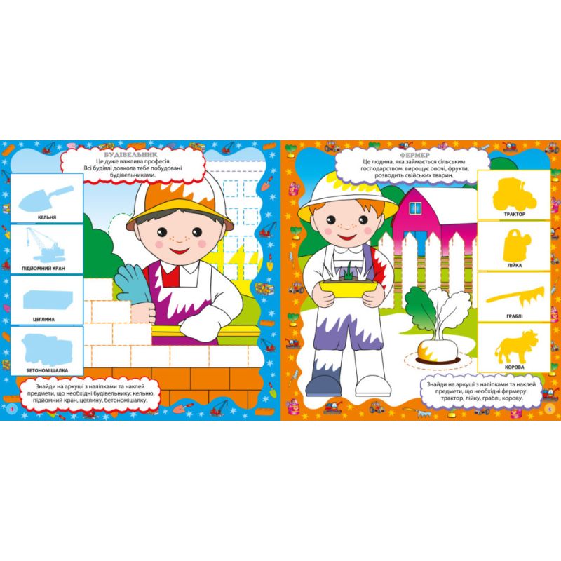 У цікавій ігровій формі книжка знайомить дітей з різними професіями. У книзі 48 наліпок, ігри, розмальовки.