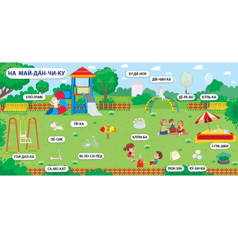Ця книжка містить різні локації — город, ліс, ферму, парк, поле, дитячий майданчик та ігрову кімнату, на яких подано тематичні слова по складах. Дитина буде розвиватися, читаючи перші слова, і розважатися, наклеюючи зображення прочитаного.
