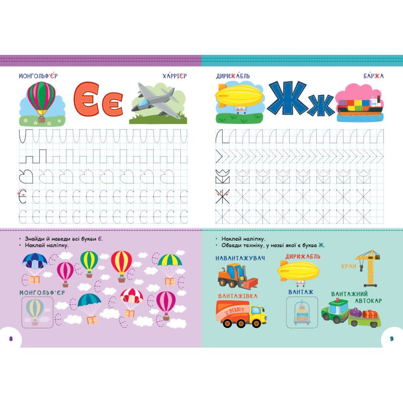 Щоб закріпити здобуті знання, дитина має виконати захопливі завдання з різними транспортними засобами та технікою: знайти й навести букви на малюнках, провести різну корисну техніку стежками й лабіринтами до цілі, знайти відмінності й з’єднати в пари однаковий транспорт, а також виконати безліч інших вправ на логіку, лічбу та письмо.