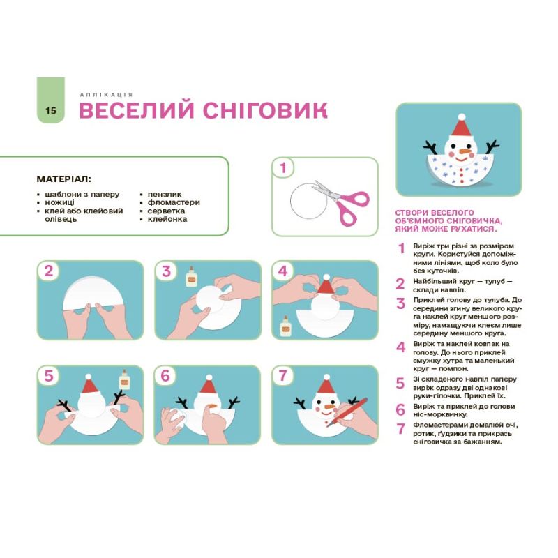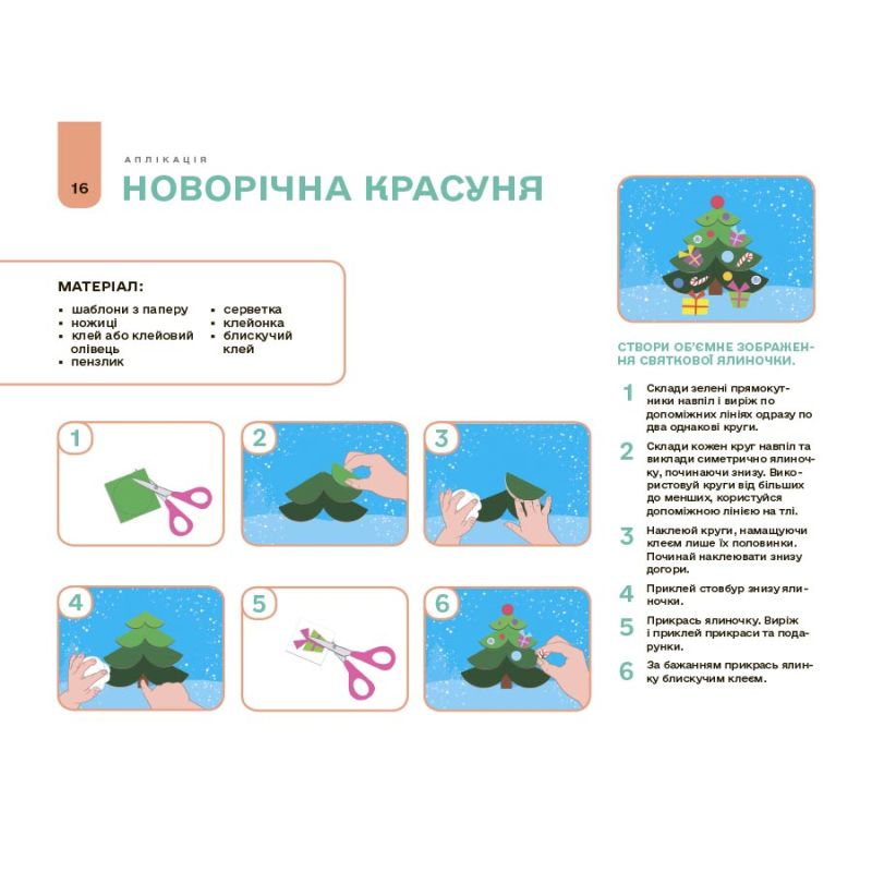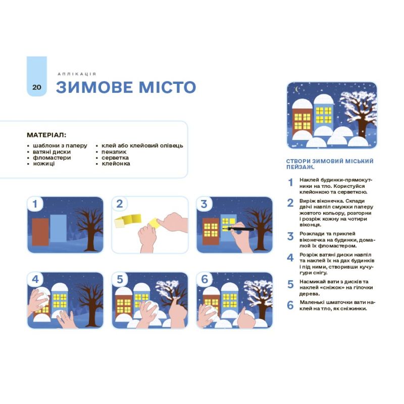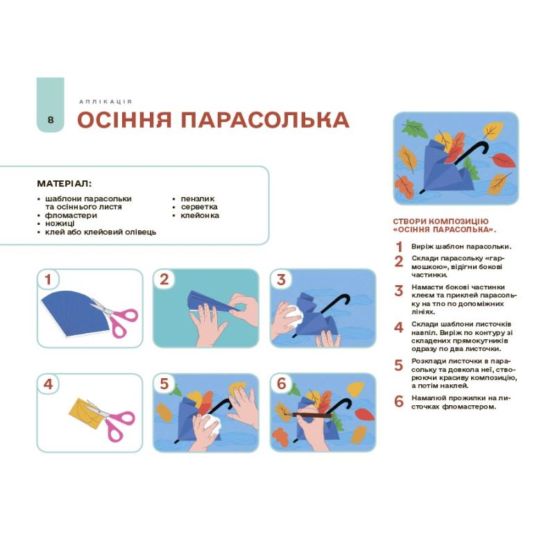 Альбом містить 14 занять з аплікації та 13 занять з ліплення; матеріали з покроковими інструкціями; шаблони для вирізання та наклеювання; аркуші-основи з відповідним фоном та допоміжними лініями.