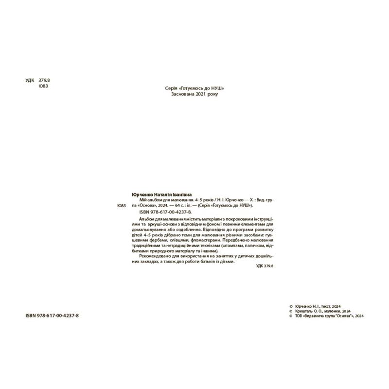 Альбом для малювання містить матеріали з покроковими інструкціями та аркуші-основи з відповідним фоном і певними елементами для домальовування або оздоблення.