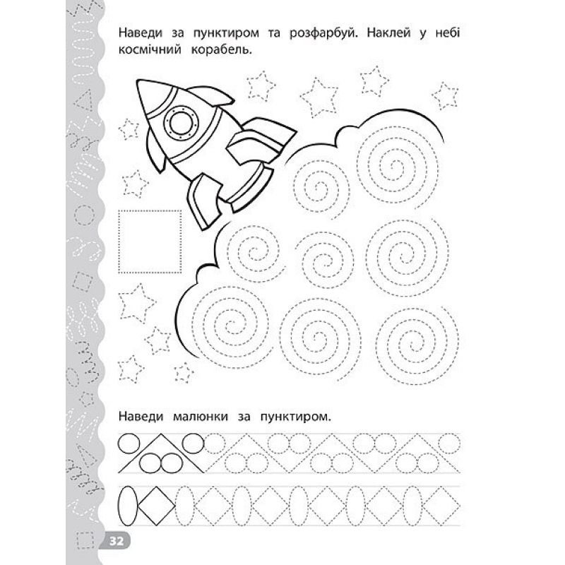Зошит спрямований на розвиток дрібної моторики й охайності. За допомогою цього видання дитина ретельно підготує руку до письма, опанує основні графічні навички (наведення контурів, малювання різноманітних фігур), привчиться чітко виводити лінії, орієнтуючись на пунктир або точки, а також зможе трохи розважитися: розфарбувати картинки, виконати захопливі завдання за допомогою наліпок. Прописи призначені для спільної роботи дорослих з дітьми дошкільного віку.