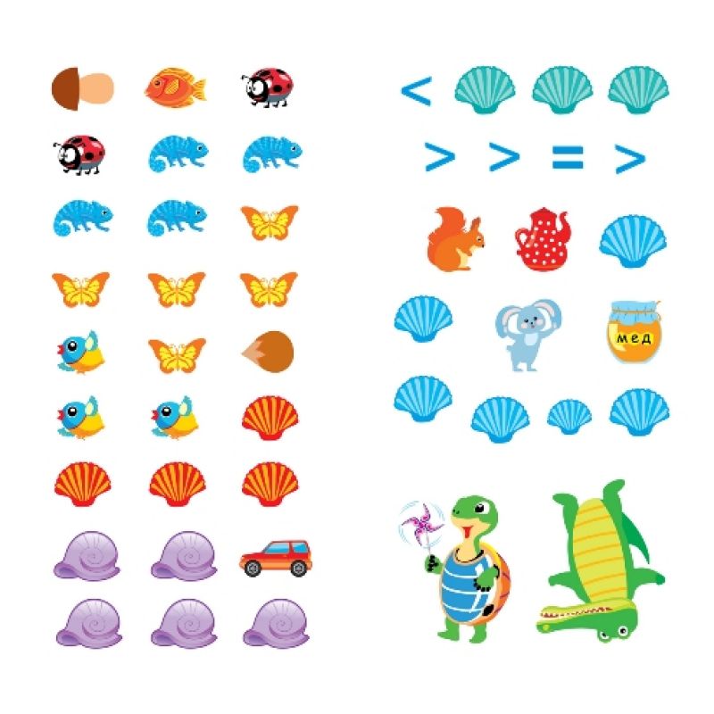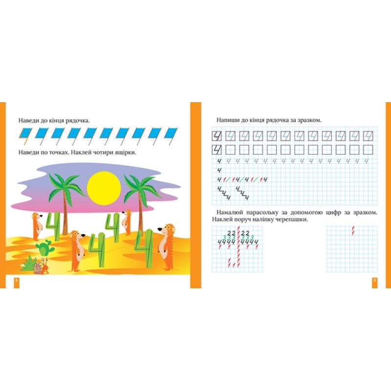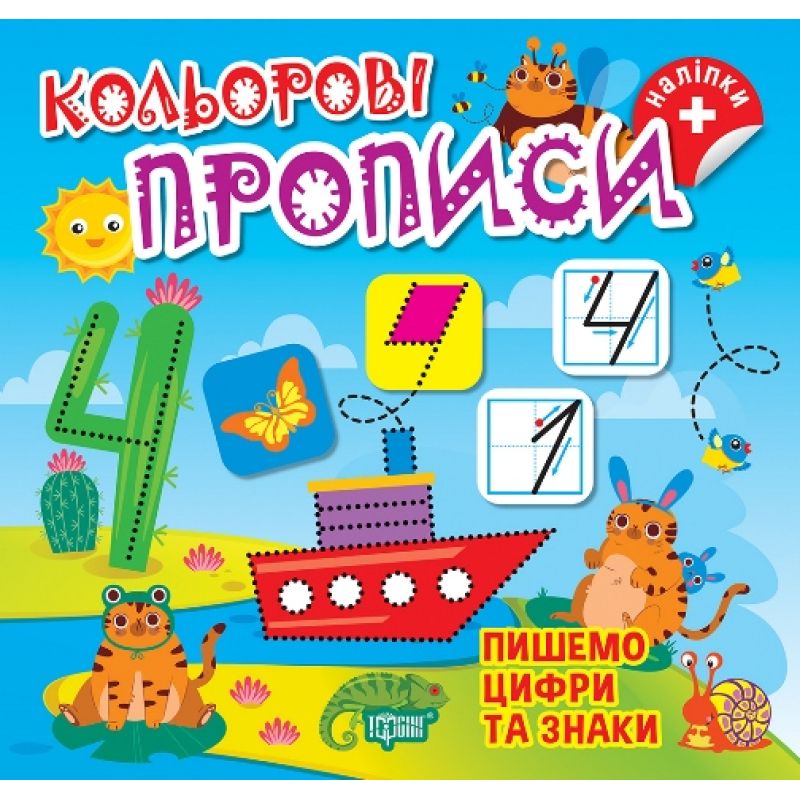 Запропоновані прописи допоможуть дитині оволодіти навичками правильного написання цифр і знаків. . Різноманітні вправи з каліграфії органічно поєднані із завданнями з математики. А робота з наліпками також сприяє розвитку дрібної моторики.