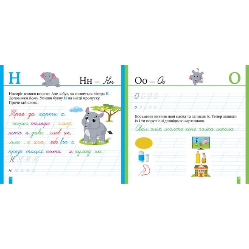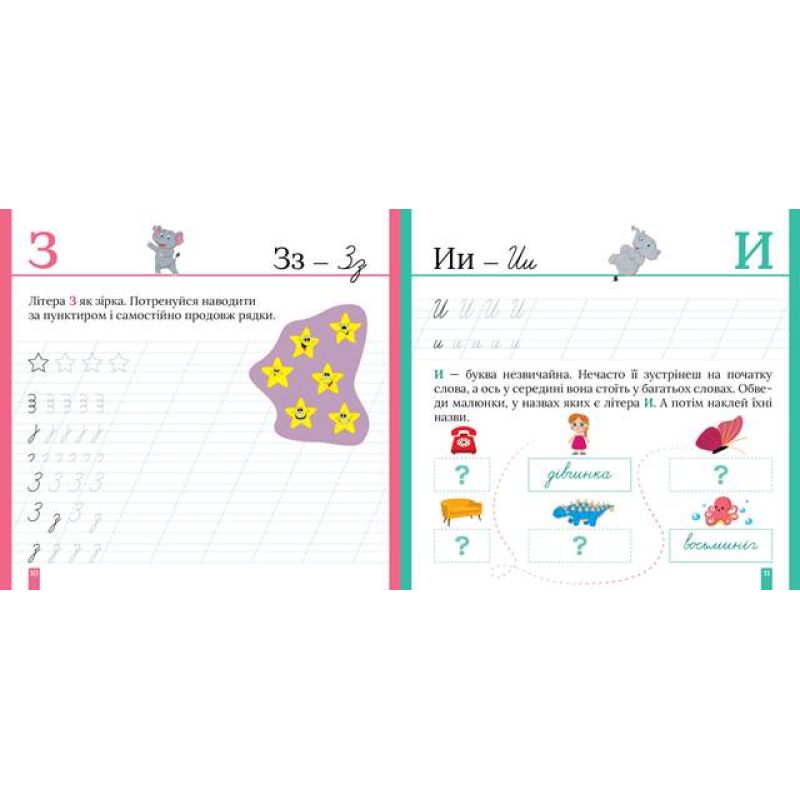 Прописи допоможуть виробити та потренувати навичку письма в косу лінію. Цьому посприяють завдання на наведення літер і слів спочатку за пунктиром, а потім і самостійне виконання. Цікаві вправи допоможуть формуванню орфографічних навичок і мовних компетенцій. Дитина поповнить свій словниковий запас і навчиться розрізняти складні випадки вживання слів. Ігрові завдання з наліпками зроблять навчання легким і захоплюючим.
