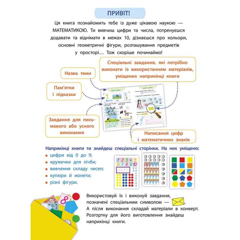Завдяки цій книзі дитина залюбки познайомиться з математикою. Використовуючи сторінки з додатковими дидактичними матеріалами, виконувати завдання буде ще цікавіше та корисніше.