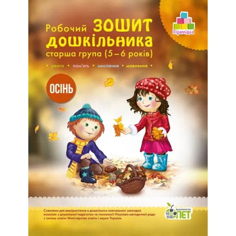 Робочий зошит для дошкільнят є складовою навчально-методичного комплекту «Пірамідка» та розрахований на три осінні місяці, що дає можливість зосередити увагу дітей на навчальному матеріалі відповідно до особливостей сезону. Зошит розроблено відповідно до вимог Базового компонента дошкільної освіти, чинних програм та методичних рекомендацій щодо розроблення навчальної літератури для дітей дошкільного віку. Видання може використовуватися вихователями в умовах дошкільного навчального закладу та батьками під час занять із дитиною вдома.