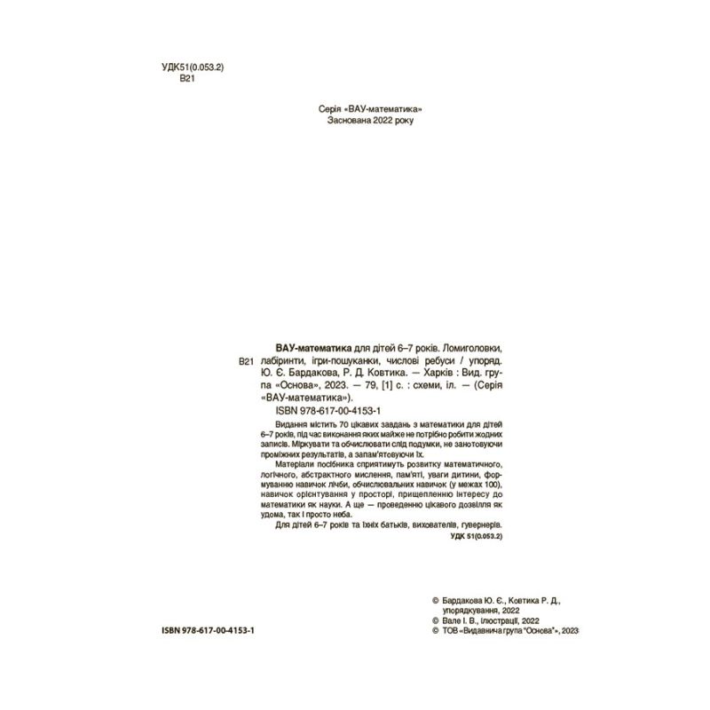 Пропонуємо вам вирушити у захопливий світ ВАУ-математики! Видання створено спеціально для Веселих, Активних та Успішних дітлахів 6–7 років, які полюбляють розв’язувати різноманітні логічні та арифметичні задачі.