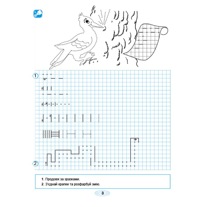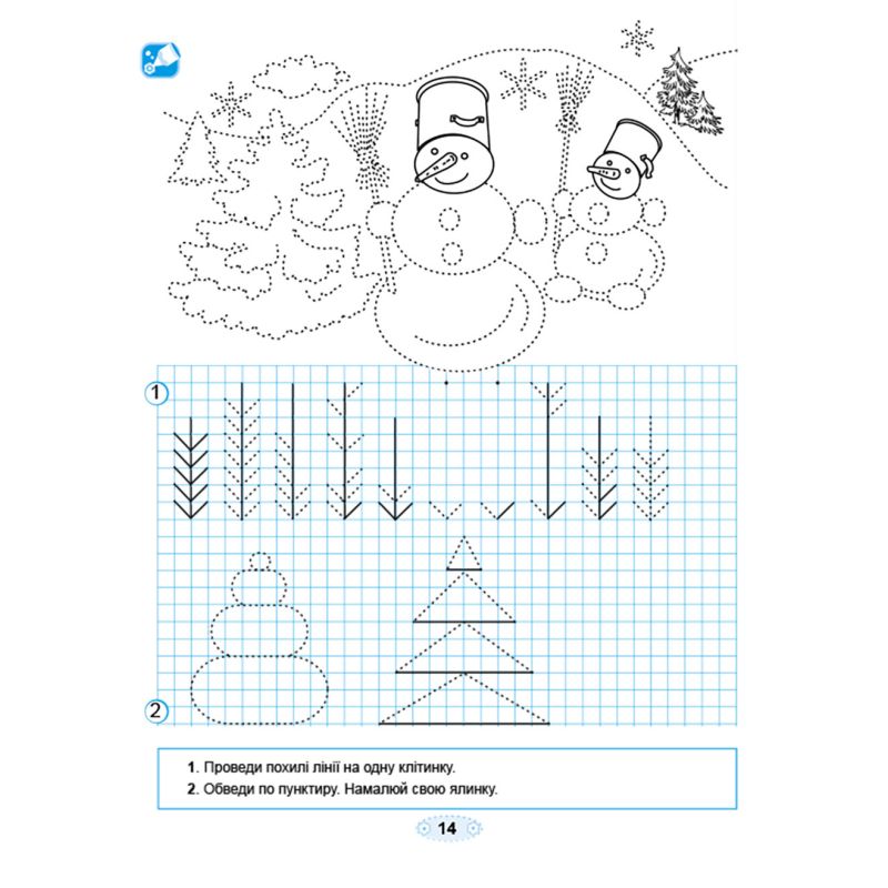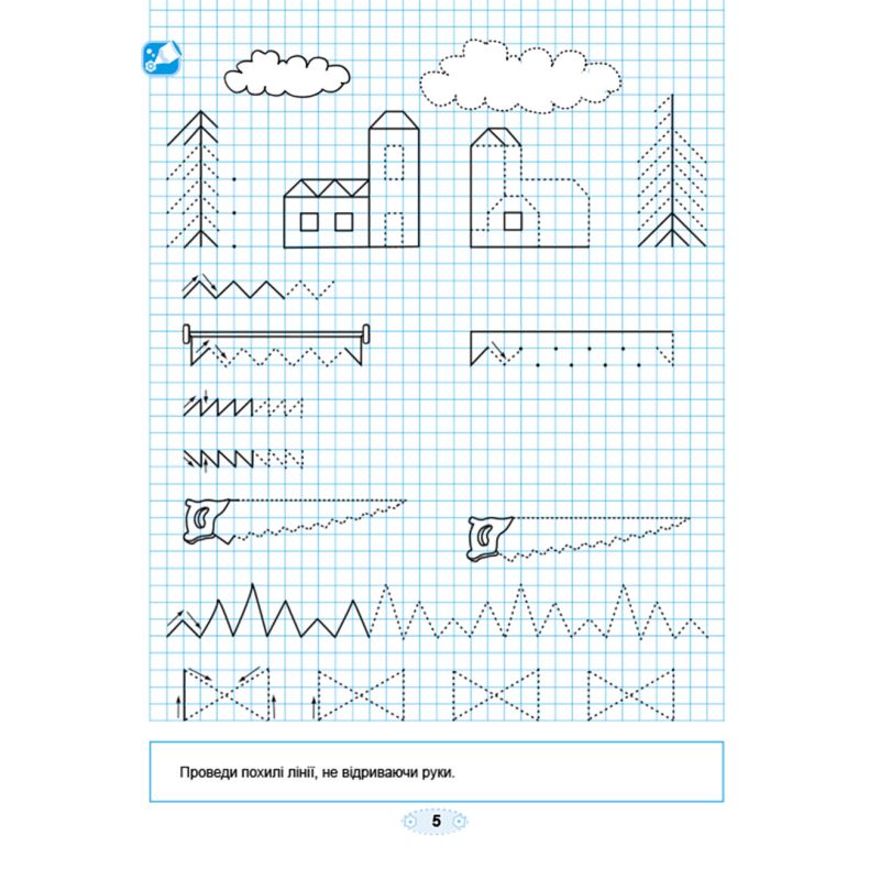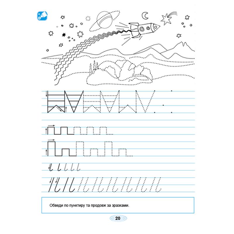 Зміст і структуру зошита (40 сторінок) побудовано за принципом від простого до складного. У першій частині зошита завдання виконуються на основі в клітину, у другій - у лінійку. Перше завдання на кожній сторінці (обвести контур зображення) є нескладним для дитини та має налаштувати на виконання більш складних, що розміщені нижче на сторінці. У зошиті подано вправи пальчикової гімнастики та слухографічні диктанти.