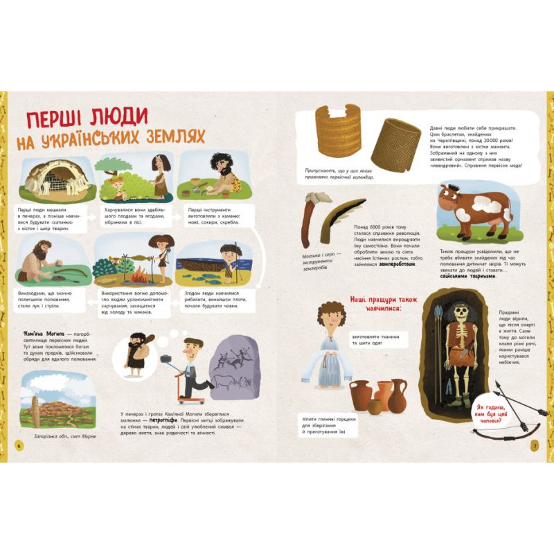 Книжка розкаже про перших людей на українських землях, про поселення давніх слов’ян, про князів, козаків… і так аж до президентів. У цій мандрівці читачі дізнаються про знакові місця, культурну спадщину та досягнення українців у різних галузях. Кожен факт підкріплюють ілюстрації, що оживлюють події і полегшують сприймання інформації.