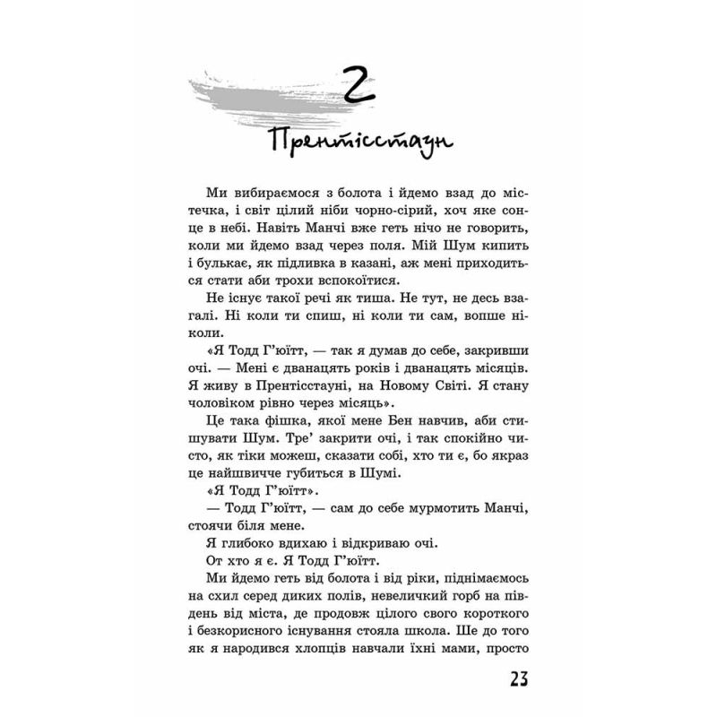 Ця нереальна, геніально продумана й болюча антиутопія оповідає про світ, сповнений шуму чужих думок, де вони, немов промовлені вголос, є фоном хвилюючої історії дорослішання.