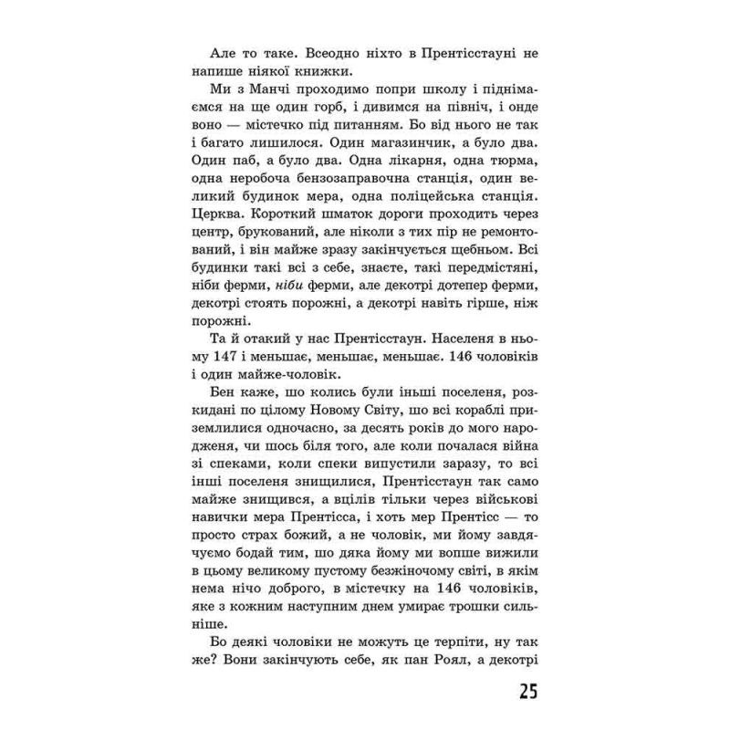 Уявіть світ, де хороші й погані думки чоловіків та хлопчиків — певна радіохвиля, яку слухають усі. Роман Несса — це водночас запаморочливий трилер та історія про страх, любов і порятунок.