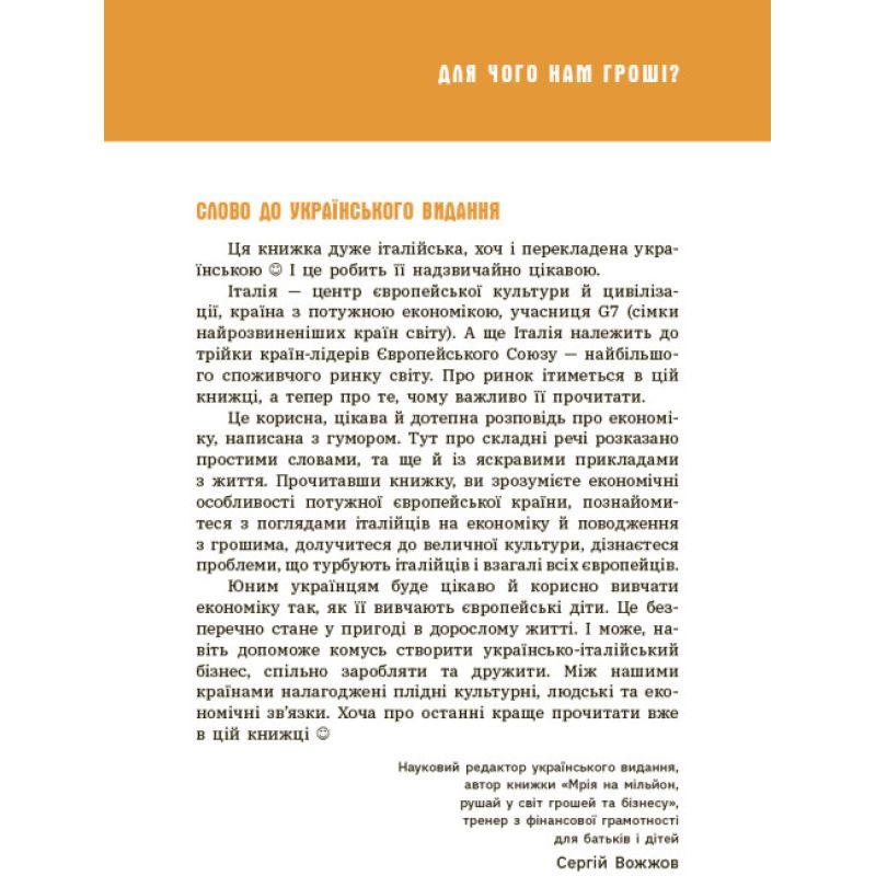 «Для чого нам гроші? Книжка, яка пояснює все про економіку» - це корисна, цікава й дотепна розповідь про економіку, написана з гумором. Ця книжка дуже італійська, хоч і перекладена українською. Чому так? Все просто! Італія – країна з потужною економікою, учасниця G7 (сімки найрозвиненіших країн світу). А ще Італія належить до трійки країн-лідерів Європейського Союзу. Прочитавши цю книжку читачі познайомляться з поглядами італійців щодо економіки та поводження з грошима, зрозуміють економічні особливості потужної європейської країни, дізнаються про проблеми, котрі турбують італійців та й взагалі всіх європейців.