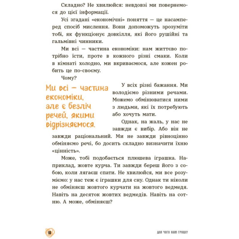 Юним українцям буде цікаво та корисно вивчати економіку так, як її вивчають європейські діти. Це безперечно стане їм у пригоді в дорослому житті. Ну і звичайно ж книжка «Для чого нам гроші? Книжка, яка пояснює все про економіку» дасть відповіді на такі запитання, як: що таке економіка та гроші? що таке робота, і чи робота – це обов’язок? хто встановлює ціни, і чи можна купити все? навіщо ми сплачуємо податки? І ще багато інших відповідей на різні запитання читачі знайдуть на сторінках цієї книжки.