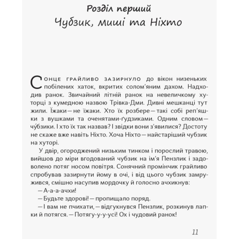 На хутірці з кумедною назвою Трівка-Дми живе чубзик Пензлик. Поряд, в інших хутірцях і поселеннях, мирно мешкають його одноплемінники, а за сільськими луками — старий чарівник Ніхто — найстарший чубзик і прапрадідусь Пензлика. Проте після сто¬літньої сплячки прокидається Біла Королева. Вона хоче повернути собі могутність, захопити та поневолити не тільки чубзиків і мешканців Ста одного королівства, але й славетний Мила-Мур — місто котів і колиш¬ніх відьом-чарівниць. На допомогу їй приходить зловісна армія опудал. Хто ж відновить мир?