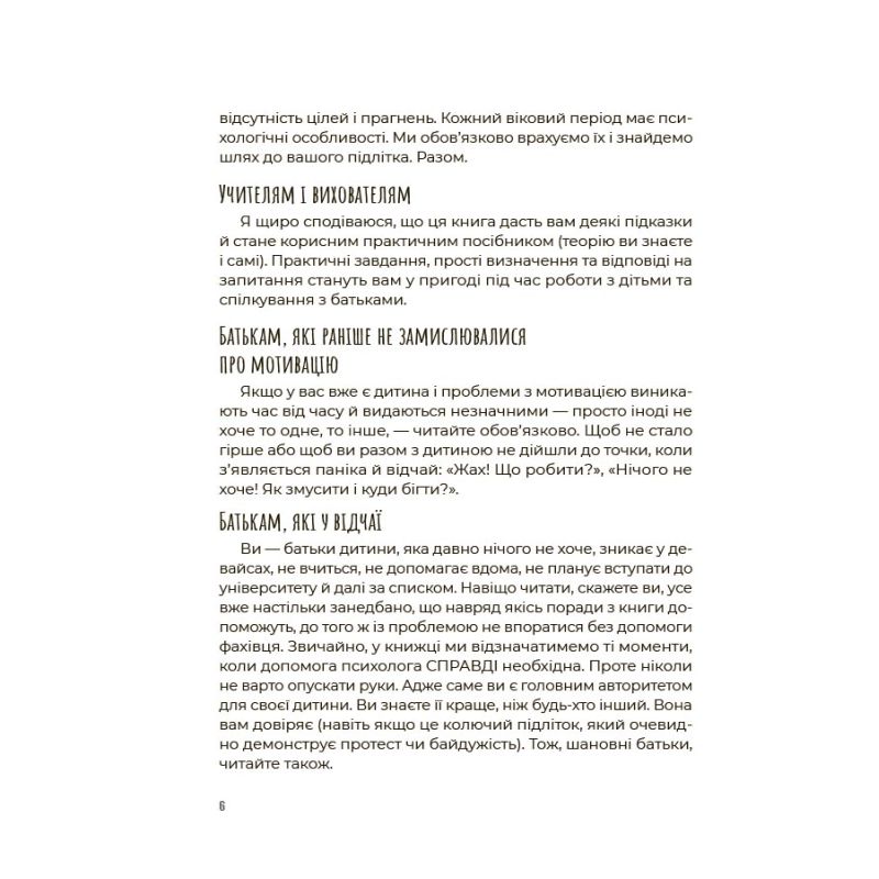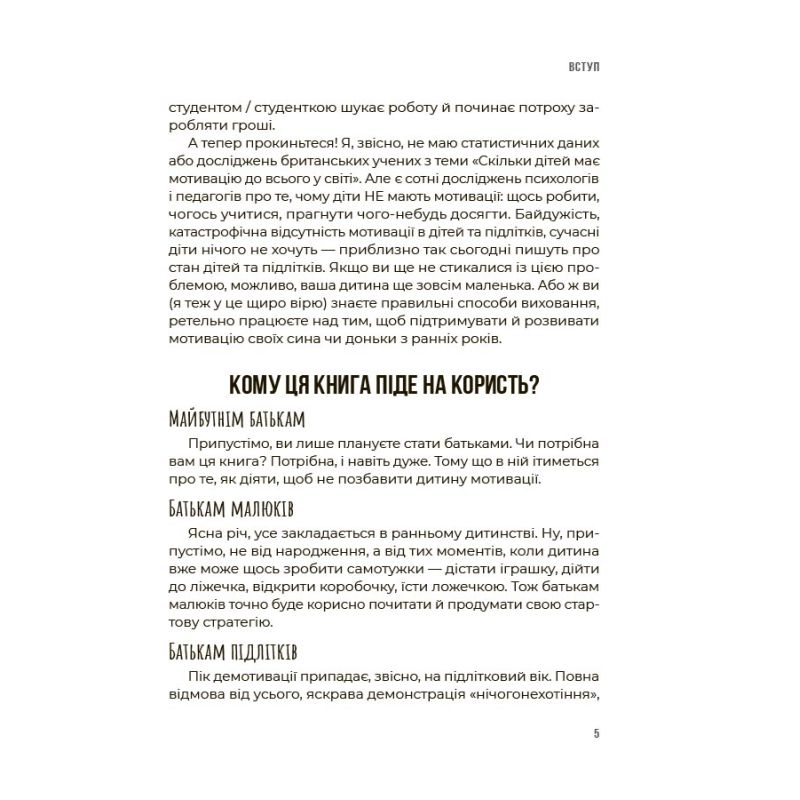 У ній ви знайдете прості пояснення, дієві поради, робочі прийоми та наочні приклади, як зрозуміти свою дитину і впевнено її мотивувати без підкупу, примусу і маніпуляцій.