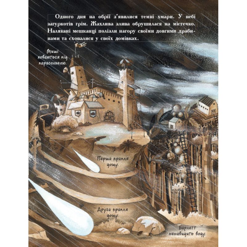 Усі драбини зламало вітром, і нещасні люди, у яких уже зовсім не залишилося припасів, не могли вийти зі своїх домівок. На щастя, за королівством наглядав хоробрий маленький лицар. Він вигадав, як урятувати мешканців, навіть попри те, що дуже боявся дощу.