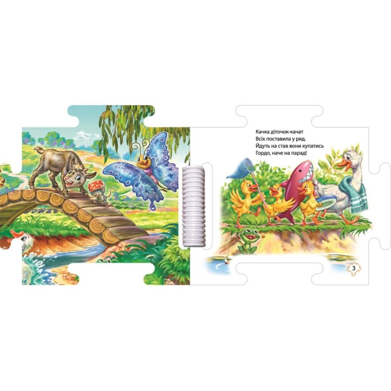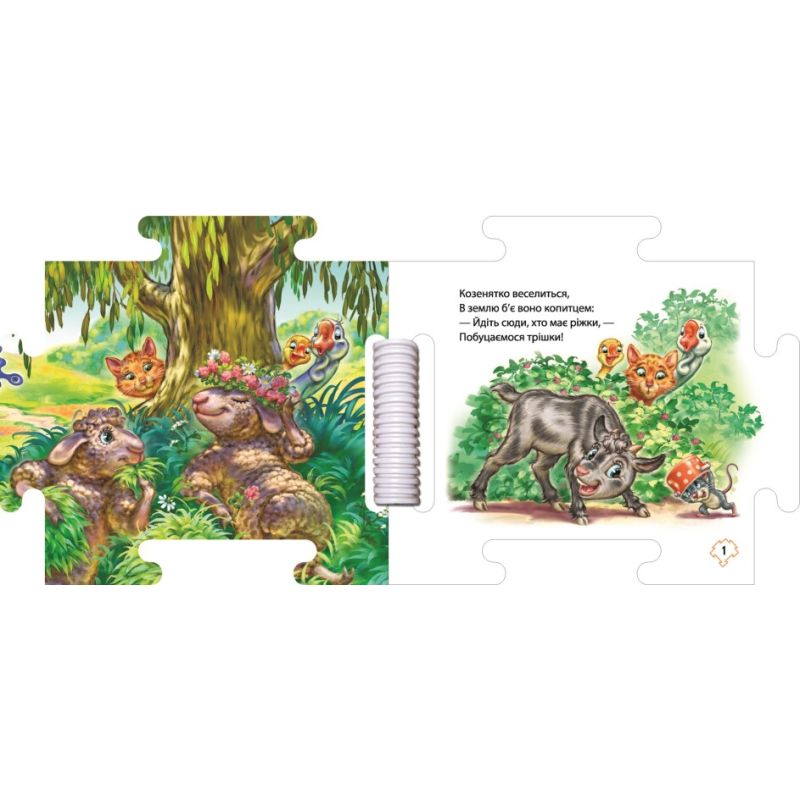 Не треба більше купувати окремо книгу, окремо набір пазлів, бо наша книга-пазл стала чудовим поєднанням цих двох видів дитячого дозвілля. Разом з героями цієї книги вітаємо вас у веселій атмосфері сільського лугу, картинка якого складається з восьми великих пазл-аркушів.