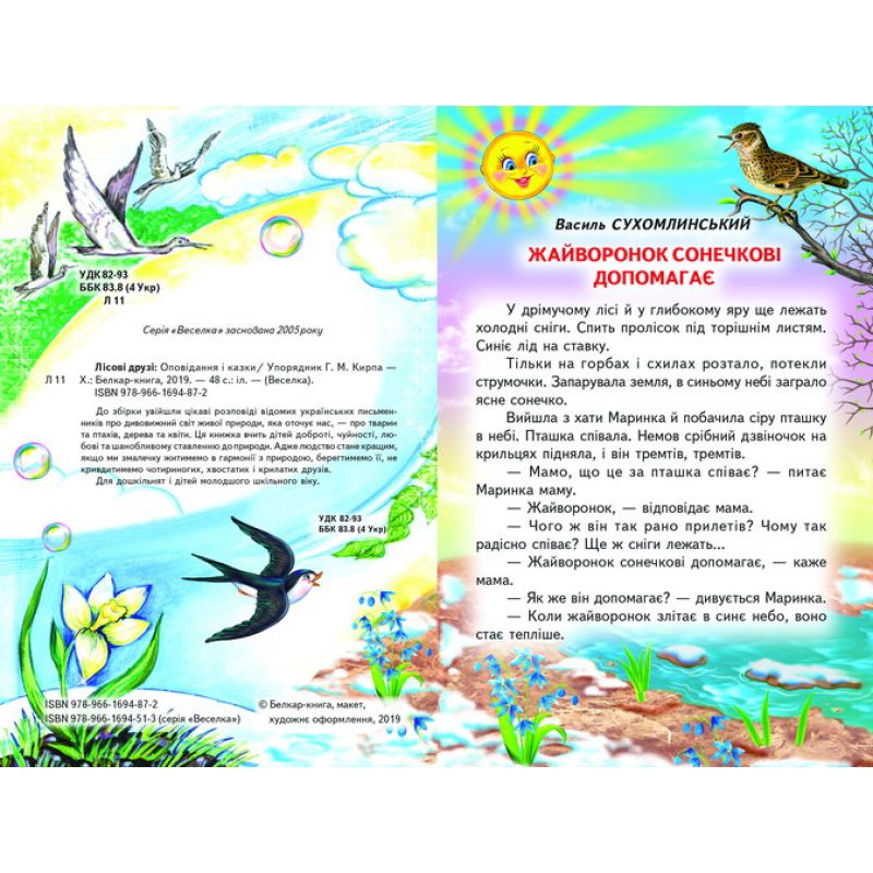 До збірки увійшли цікаві розповіді відомих українських письменників (В.Сухомлинський, О. Буцень, О. Вишня, О. Гончар, Г. Тютюник та ін.) про дивовижний світ живої природи, яка оточує нас, - про тварин та птахів, дерева та квіти. Ця книжка вчить дітей доброті, чуйності, любові та шанобливому ставленню до природи. Адже людство стане кращим, якщо ми змалечку житимемо в гармонії з природою, берегтимемо її, не кривдитимемо чотириногих, хвостатих і крилатих друзів.