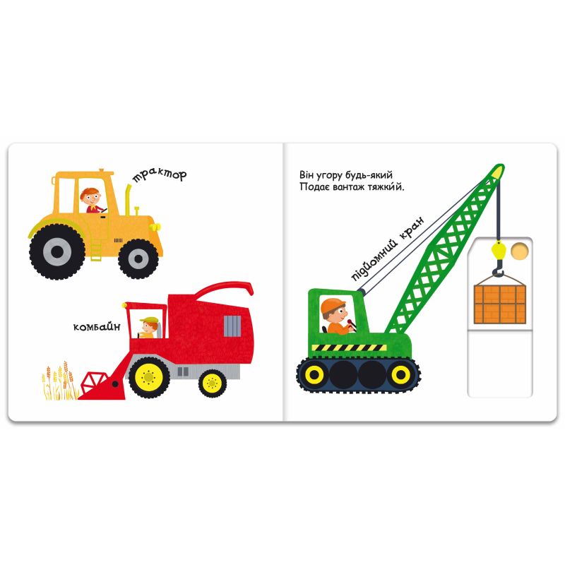 У цій книзі можна не лише уважно роздивитися транспортні засоби, а ще й самому «покерувати» бульдозером, пожежною машиною або таксі. Унікальні розвивальні книжки з рухомими елементами заохочують дитину до знань, а також сприяють розвитку дрібної моторики, пам’яті та уваги, навичок мовлення та лічби.