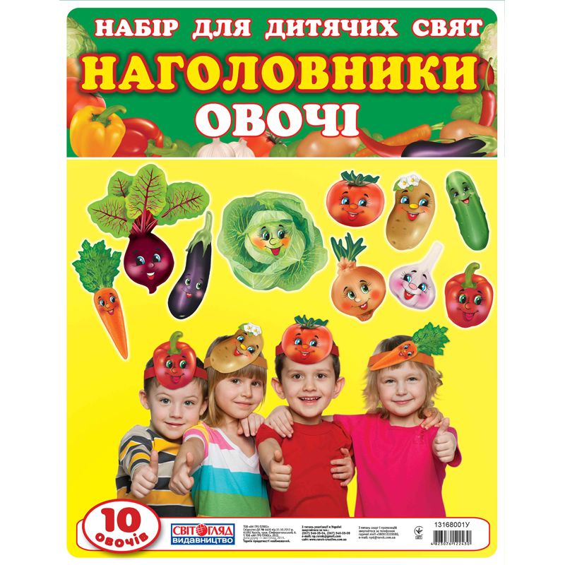 Набір "Наголовники для дитячих свят. Овочі" виконаний з ламінованого картону, є кріплення навколо голови. У наборі 10 наголовникiв для дітей. Формат 30х21 см.