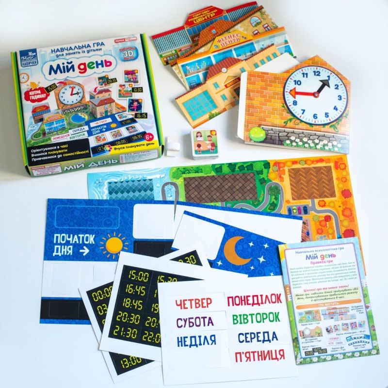 Іноді навіть дорослим складно спланувати свій день. Але ж діткам ще важче! Яскраві картинки, об’ємні 3D-будинки та 3D-годинник із рухомими стрілочками допоможуть дитині зрозуміти важливість режиму дня та правильного планування своїх справ. Маленький гравець ніби потрапляє у світ дорослих і сам ухвалює рішення та планує, що, де і коли робитиме. Мета гри: навчити дітей продумувати свій день, дотримуватися правильного режиму й орієнтуватися в часі. Зробіть гру частиною навчання з новими варіантами розваг! Перед початком захоплюючої гри розмістіть годинник на ігровому полі та зберіть будинки. Розкладіть картки підряд та уважно їх розгляньте. Чи готові ви обрати гру, яка розвине ваші навички та знайомство з часом?