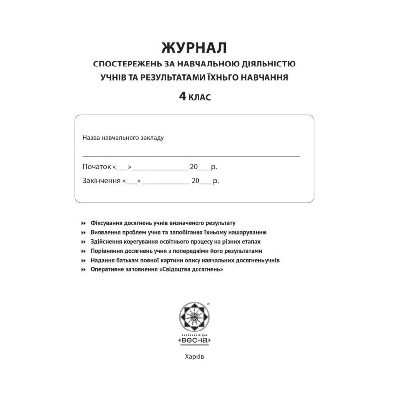 НУШ Журнал спостережень за навчальною діяльністю учнів та результатами їхнього навчання Весна 4 клас видавництва Весна можна купити в інтернет-магазині Книгован зі знижкою або з безкоштовною доставкою по Україні.