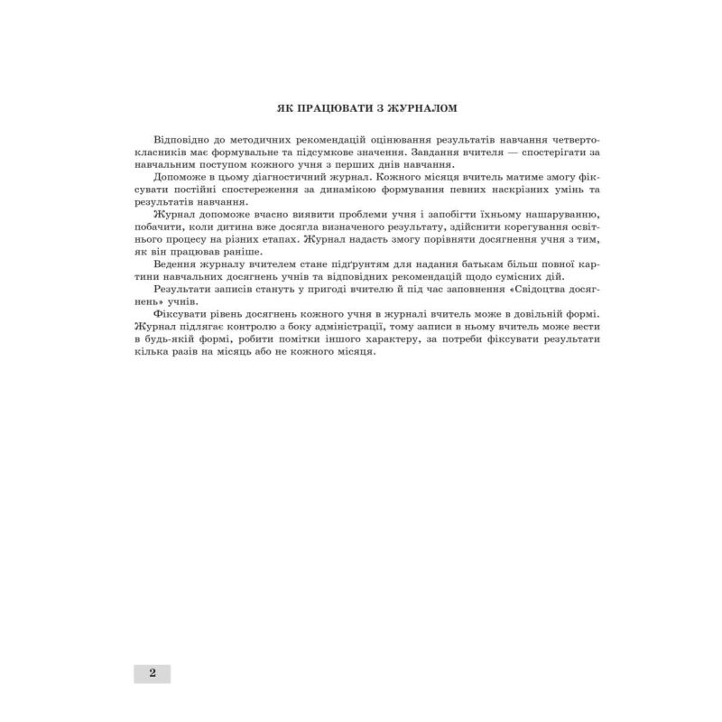 "Журнал спостережень за навчальною діяльністю учнів та результатами їхнього навчання 4 клас НУШ" - допомагає вчителю здійснювати та фіксувати рівень розвитку учнів, динаміку формування певних навичок та особистих досягнень учнів 2 класу.