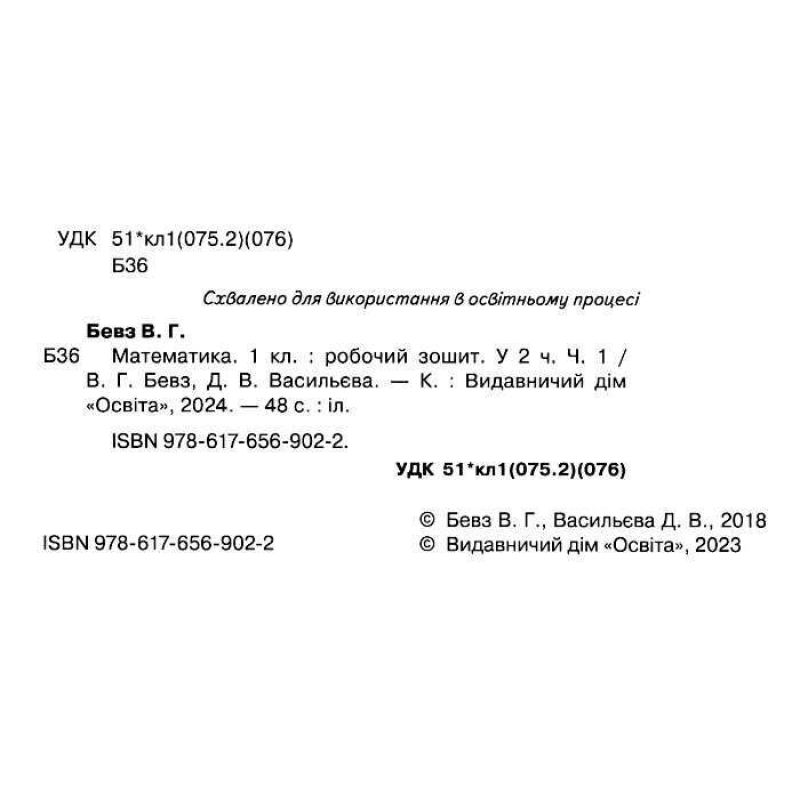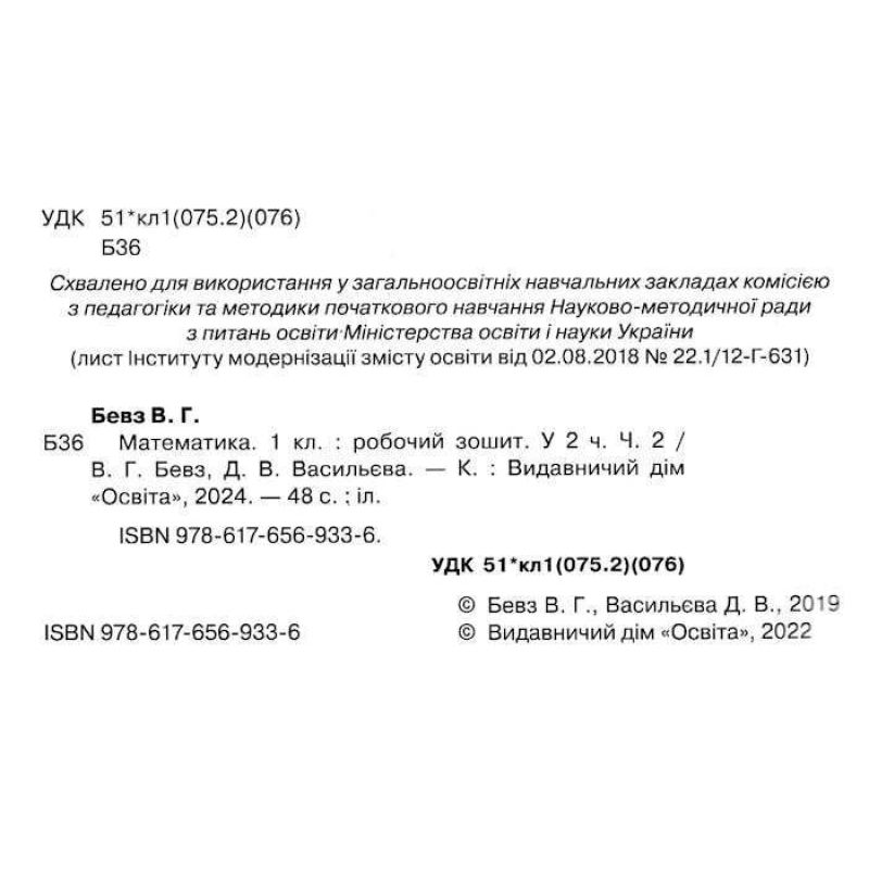 Робочий зошит з математики розроблено відповідно до підручника для 1 класу закладів загальної середньої освіти «Математика» (автори В. Г. Бевз, Д. В. Васильєва) та схвалено для використання у закладах загальної середньої освіти комісією з педагогіки та методики початкового навчання Науково-методичної ради з питань освіти МОНУ (Лист ІМЗО від 02.08.2018 №22.1/12-Г-631).