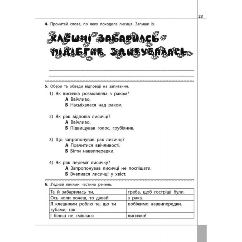 Повчальні і просякнуті народною мудрістю українські казки стануть у пригоді учню під час оволодіння навичками усвідомленого читання та допоможуть навчитися висловлювати власні думки з приводу прочитаного. На сторінках посібника можна побачити такі твори: «Ворона», «Старий тигр», «Пшеничний колосок», «Пташина суперечка», «Чудовий сад», «П’ять монет», «Гуси-лебеді», «Названий батько».