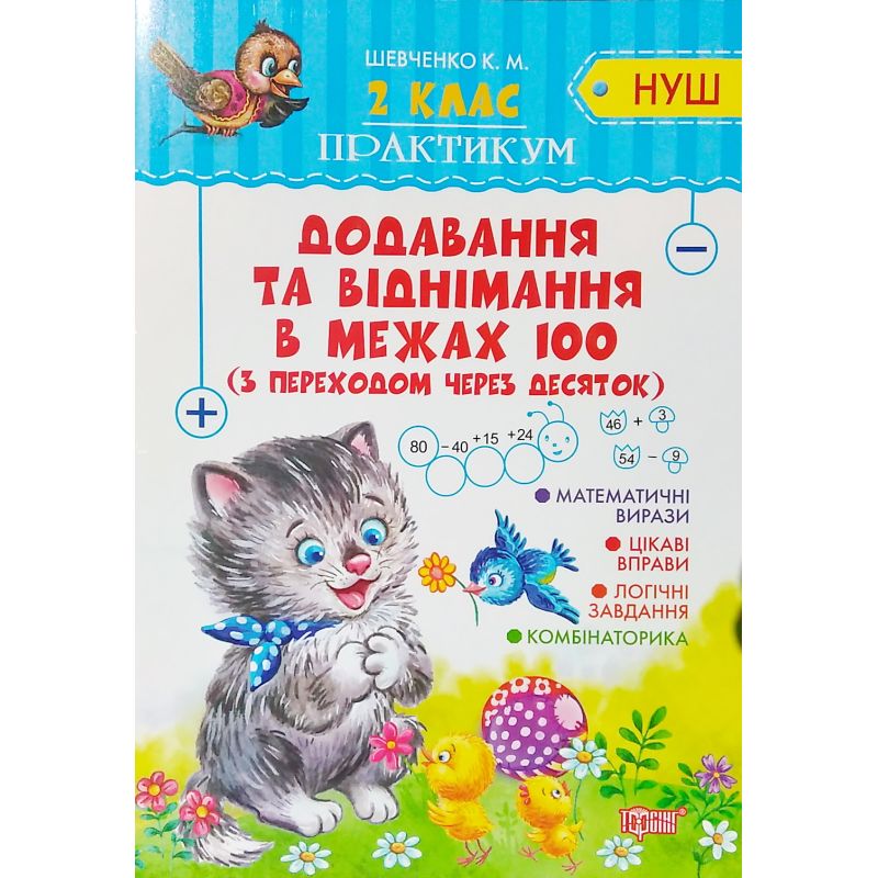 Посібник "НУШ. Практикум 2 клас. Додавання і віднімання у межах 100 з переходом через десяток" містить приклади з додавання і віднімання за програмою Нової української школи для другого класу: