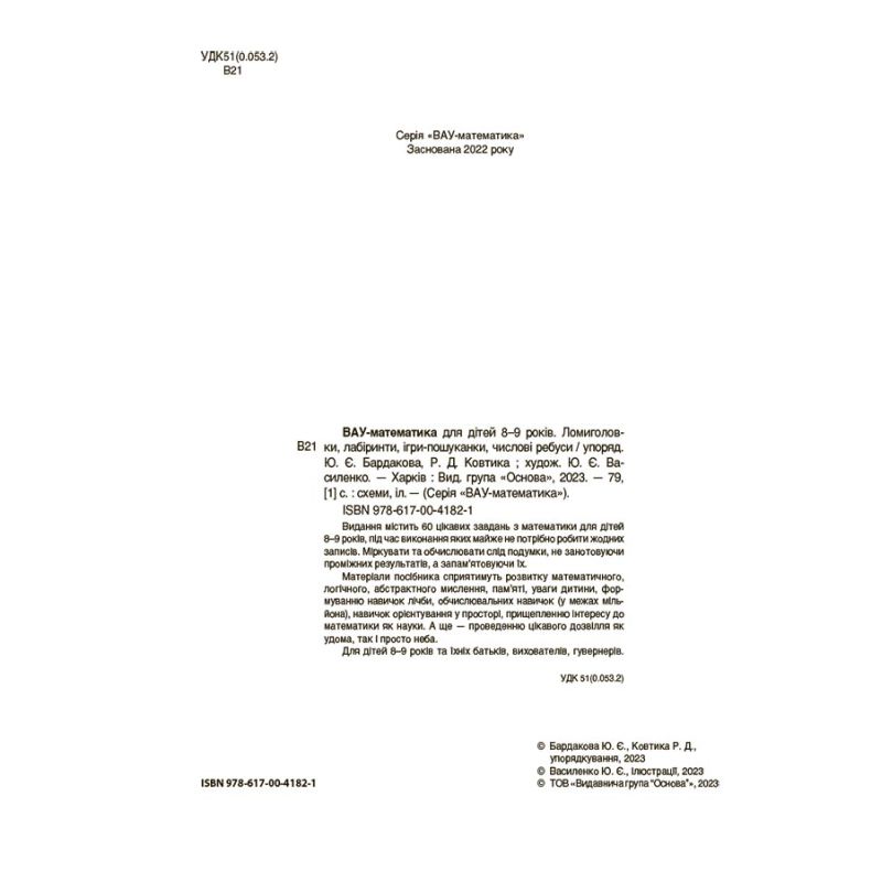Пропонуємо вам вирушити у захопливий світ ВАУ-математики! Видання створено спеціально для Веселих, Активних та Успішних дітлахів 8–9 років, які полюбляють розв’язувати різноманітні логічні та арифметичні задачі.