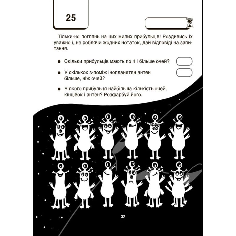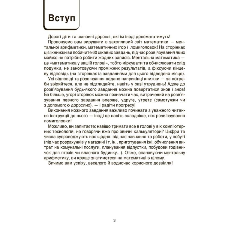 На сторінках цієї книжки ви побачите 60 цікавих завдань, під час виконання яких майже не потрібно робити жодних записів. Міркувати та обчислювати слід подумки, не занотовуючи проміжних результатів, а запам’ятовуючи їх.