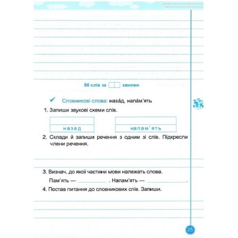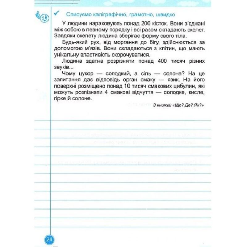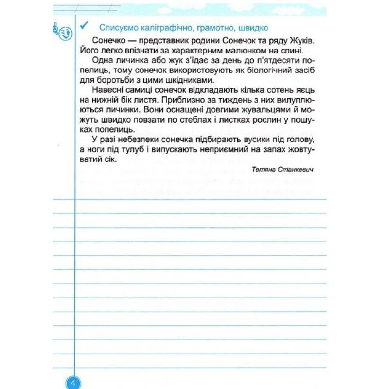Зошит містить тексти й систему завдань для поліпшення навичок усвідомленого списування, вивчення словникових слів. Вправи спрямовані на розвиток уміння писати грамотно, каліграфічно, швидко. Завдання зошита можна використовувати під час занять із дітьми вдома, у закладах загальної середньої та корекційної освіти.