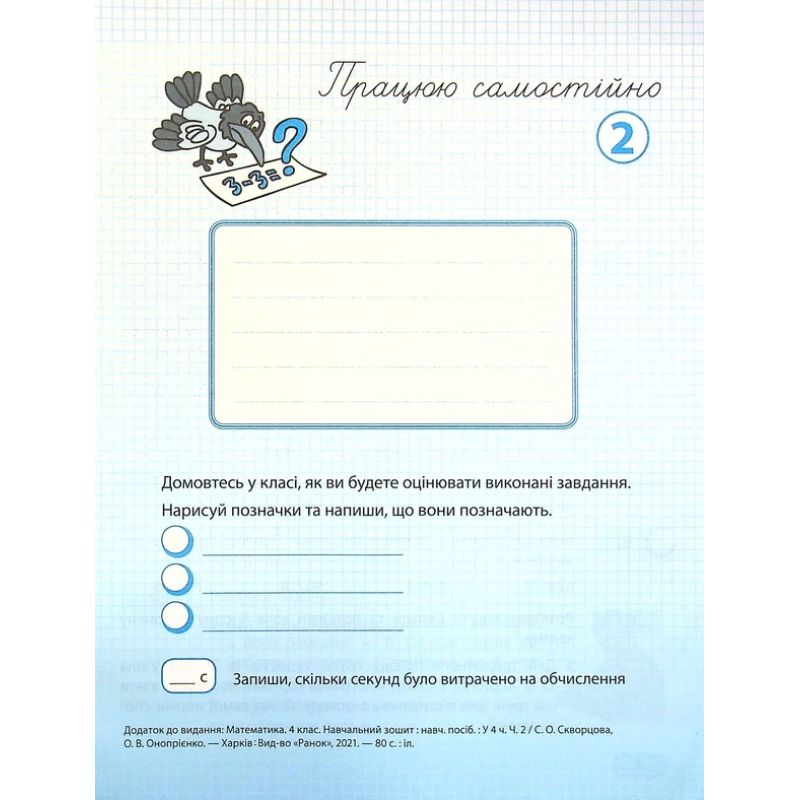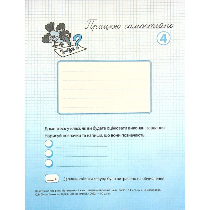 Посібник складений відповідно до Типової освітньої програми, розробленої під керівництвом О. Я. Савченко, і є складовою навчально-методичного комплексу з математики для 4 класу авторів Світлани Скворцової, Оксани Онопрієнко.