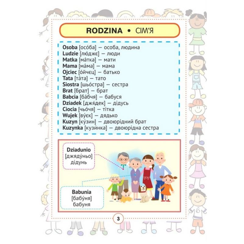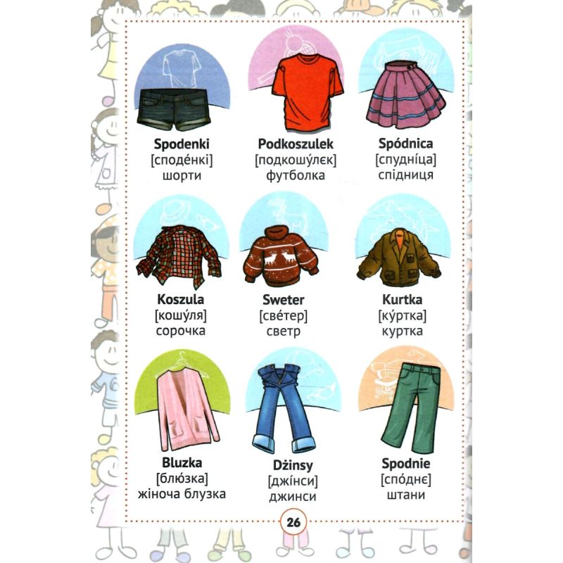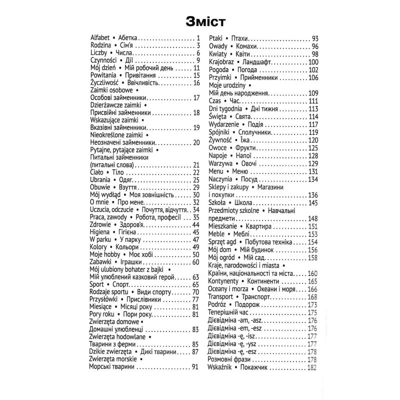 Польско-український візуальний словник містить близько 2000 слів і словосполучень із 68 лексичних тем. Для кращого засвоєння мовного матеріалу пропоновані слова і сполучення слів проілюстровані малюнками. лексичний матеріал підібрано відповідно до чинних програм з іноземних мов нової української школи. Правила читання, таблиця неправильних дієслів і транскрипція (запис вимови польских слів українськими буквами) значно полегшать вивчення польскої мови.