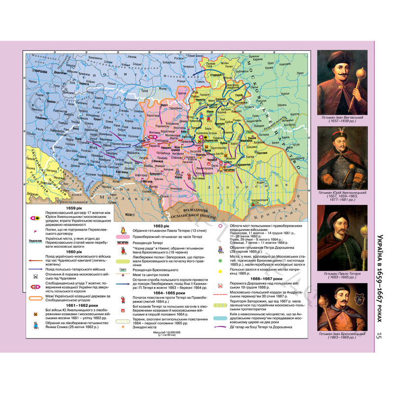 Головна увага приділена подіям Визвольної війни 1648-1709 років, що демонструються на 11 картах. Кожній воєнній кампанії присвячена окрема карта, що дозволяє учителеві та учневі ретельно розібратися в подіях.