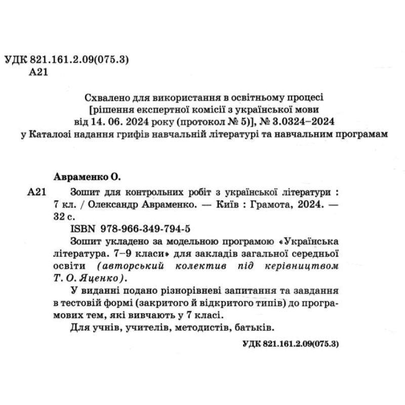 - Зошит для контрольних робіт Українська література 7 клас АвраменкоЗошит укладено за модельною програмою «Українська літе..