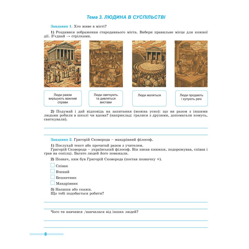 Навчальний посібник з громадянської освіти для 8 класу – не просто супровід до уроків, а простір для роздумів і самовираження. Він створений для того, щоб допомогти восьмикласникам та восьмикласницям побачити себе як частину суспільства, осмислити свої права, потреби, цінності, навчитися співжити з іншими у світі, який змінюється.