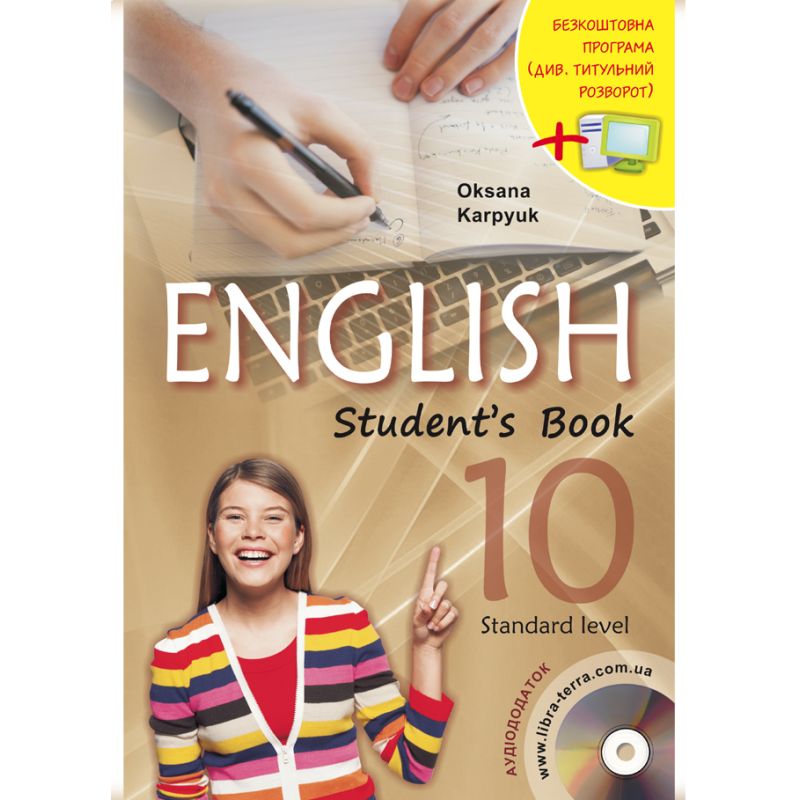 Підручник "Підручник для 10 класу: Англійська мова (Карпюк)" розроблено згідно із Державним стандартом початкової загальної середньої освіти на основі авторської Концепції формування учнівської здібності до міжкультурного спілкування та взаємодії. Навчання будується з опорою на нескладний мовний матеріал і прості ситуації спілкування, що дає змогу активізувати комунікативні навички, здобуті у початковій школі.