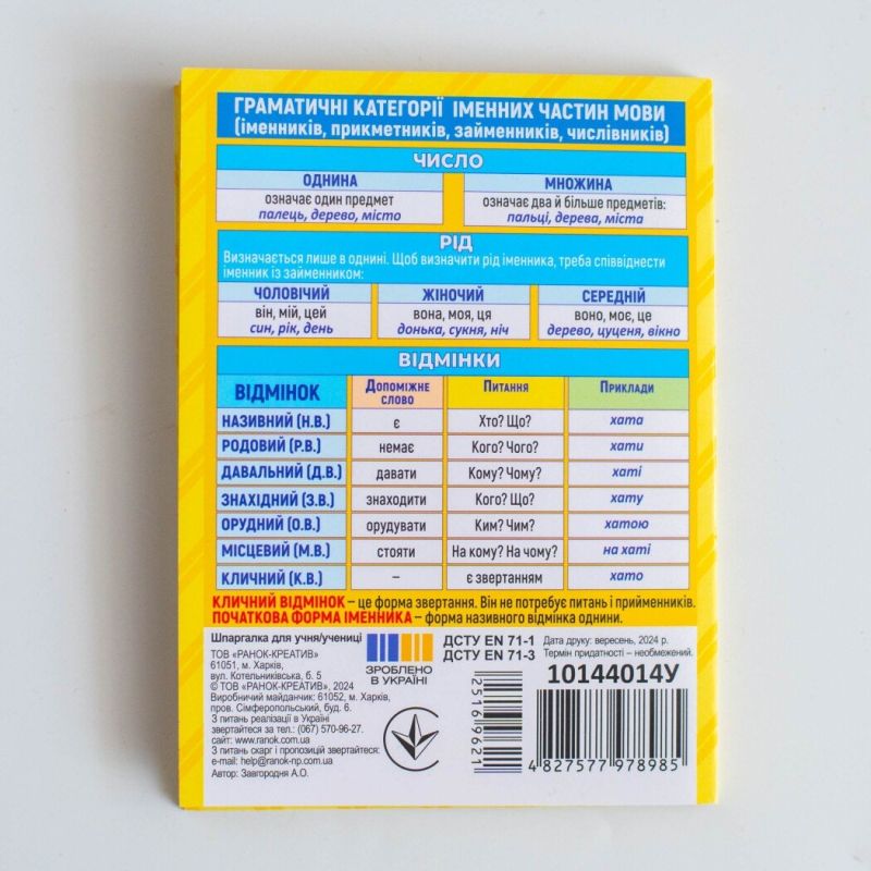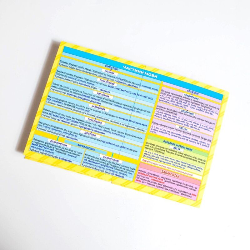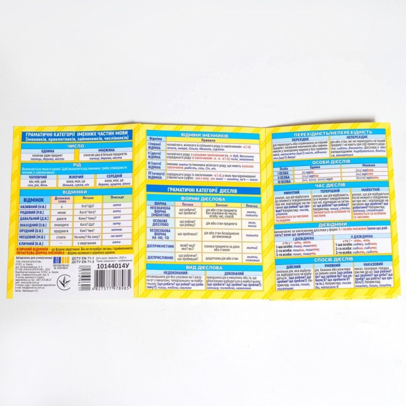 Шпаргалка з української мови для учнів 7-11 класів! Ваша зручна помічниця в навчанні! Ця компактна книжечка форматом 10,3х13,9 см ідеально підійде для швидкого повторення матеріалу. Двосторонній дизайн! Завдяки гармошці з 5 перфораціями, ви отримаєте чіткі правила, визначення, схеми та таблиці. Надруковано на якісному крейдованому папері щільністю 300 мг, що забезпечує довговічність. Глянцева ламінація з обох сторін захистить інформацію від впливу вологи, пилу та забруднень. На одній стороні ви знайдете корисну інформацію про частини мови, відміни іменників та граматичні категорії. На іншій – фонетику і синтаксис.