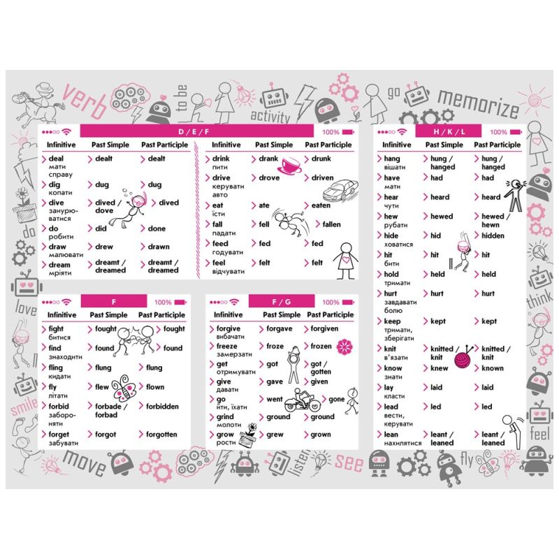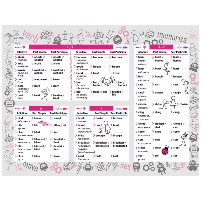 Утворення неправильних дієслів не підлягає жодному правилу. Єдиний варіант — вивчити їх на пам’ять, як таблицю множення. Стікербук пропонує два способи запам’ятовування дієслів: за алфавітом і за особливостями утворення