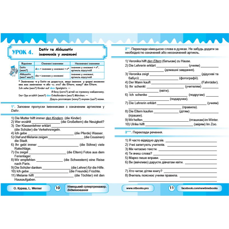 Весь матеріал книжки розбитий на 17 уроків, кожний з яких присвячений певному відмінку іменників з артиклем і займенників у жіночому, чоловічому або середньому роді. Подальші уроки містять вправи на повторення матеріалу попередніх уроків. Завдяки цьому в учнів з’являється чітке розуміння матеріалу, усне спілкування стає набагато простішим.